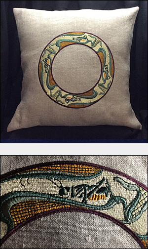 Blue Ice Textiles stitches "Arts and Crafts, Art Deco, Bungalow, Craftsman and Prairie" design styles using machine-embroidery. These concepts and design styles are over a hundred years old, but are timeless sources of inspiration for homeowners today. The thread colors Blue Ice Textiles uses are traditional colors featured during the Arts and Crafts and Craftsman period. All designs are stitched on a neutral shade of linen. New designs by Leon Roulette and vintage (c.1906–1928) Arts and Crafts, Craftsman and Art Deco designs by artists featured in the Keramic Studio publications are at the forefront of our collection.