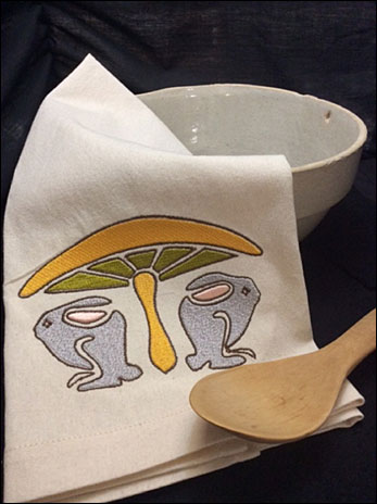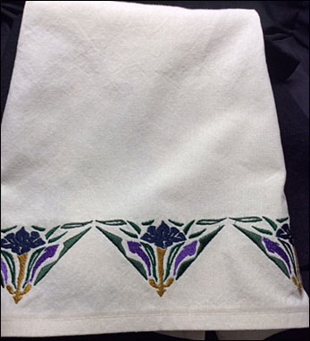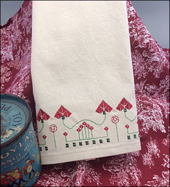 Kitchen towels are stitched on unbleached cotton muslin, measuring approximately 16" x 30". The designs are vintage designs developed during the Arts and Crafts era. The designs are stitched in fade-resistant polyester thread.